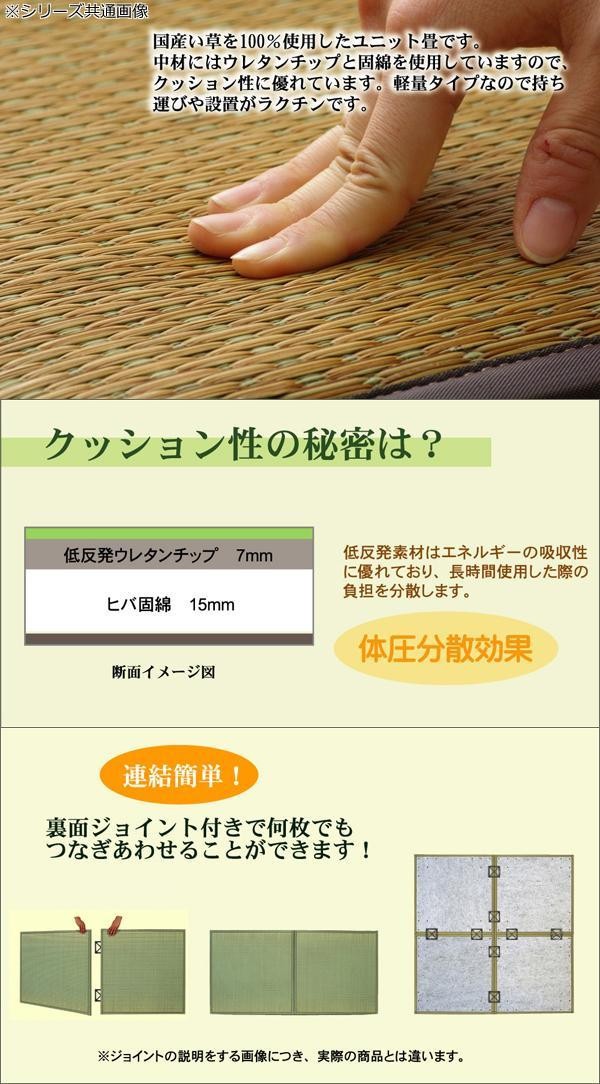fk094igrjsユニット畳のセットです床に置くだけで和のスペースが出来上がります サイズ 82×82×2.2cm(1枚) 個装サイズ:83×83×17cm 重量 個装重量:11800g 素材・材質 表地:い草 中材:ウレタンチップ7mm、ヒバ固綿15mm 縁:PP、PE 付属品 連結用ジョイント×12 生産国 日本 軽量タイプで簡単設置 ユニット畳のセットです床に置くだけで和のスペースが出来上がります