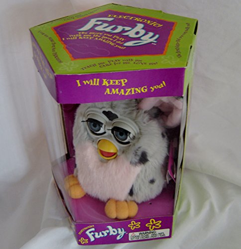 Black electronic Furby with brown eyes, pink ears, white feet. Has original box and all instruction papers included