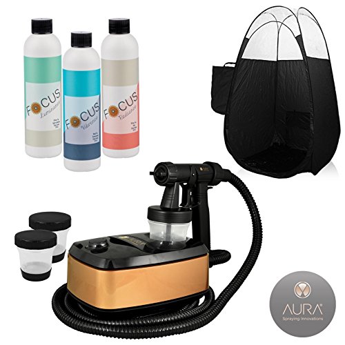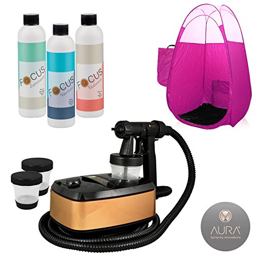 Bundle includes: Aura Allure Spray Tanning Machine, Spray Tanning Solution: Focus Luminance Medium Tan, Focus Radiance Ultra Dark Tan and Focus Vibrance Rapid Tan, Extra Large "Skylight" Style Spray Tanning Tent with Carrying Bag.