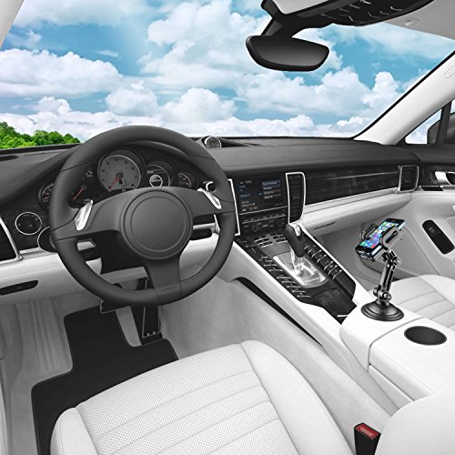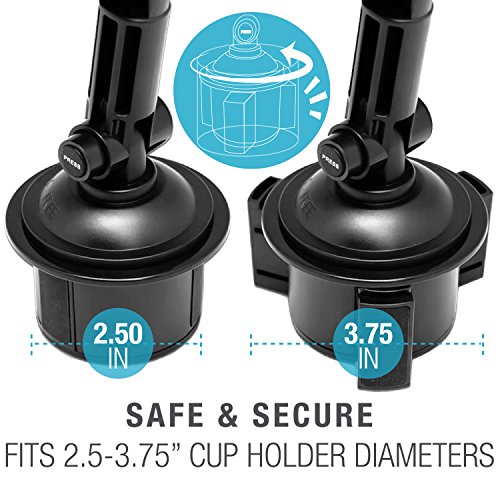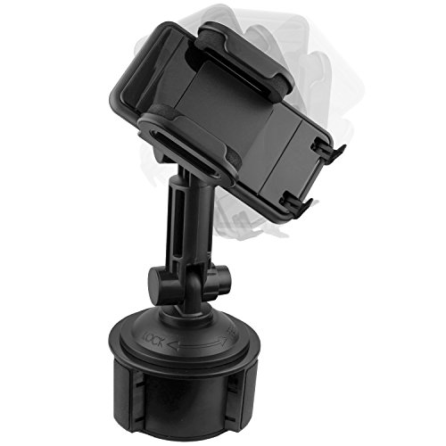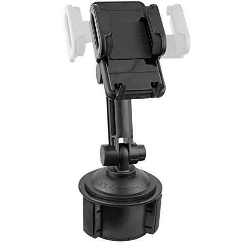 Securely mount most Smartphones in your car's cup holder (fits Smartphones widths of 2"-4"). Its lightweight/foldable build has 360° adjustable rotation for many views (portrait, landscape, etc), & works with skins & bulky cases like Otterbox (fits 0.75" thickness). A quick mounting system locks/releases your device in seconds. A highly adjustable cup holder mount fits most cup holders (2.5"-3.75" diameters), while still being simple to remove & reuse. Hand washing restores the cradle to mint condition. It accommodates all essential Smartphone buttons & ports. Cushioned no-slip grips protect your device on bumpy roads. Accessing your device on the road, for music, calls & navigation has never been more efficient.
