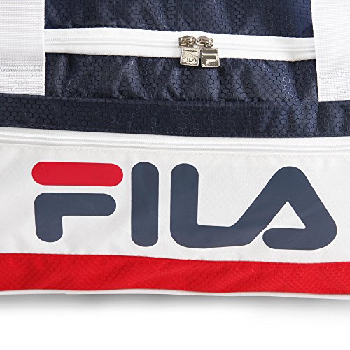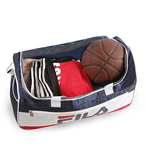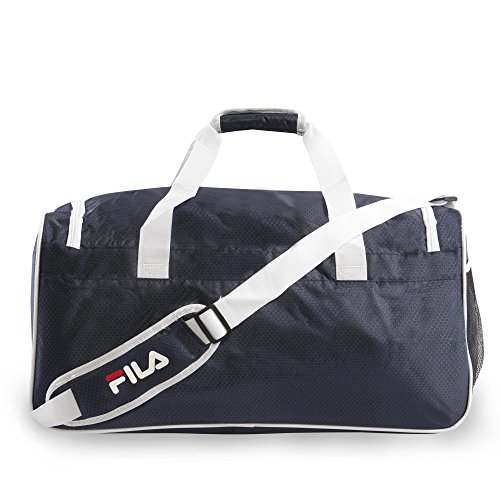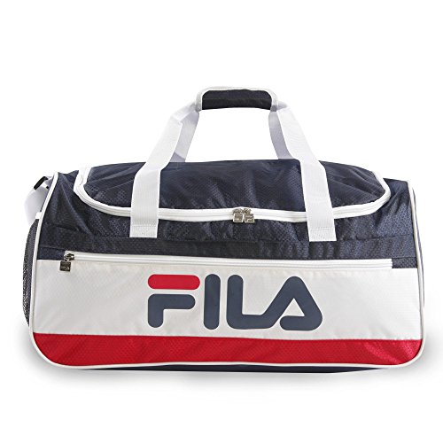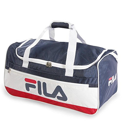 Studio : Fila Luggage Publisher : Fila Luggage Binding : Apparel Product Description Carry your gear to the gym or to training in this medium size design sport duffel bag. Compartments provide enough room for training clothes, shoes, water bottle, and other accessories. Side mesh pocket is perfect for additional items. Includes a comfort carrying shoulder strap. 12" x 22" x 13" 0