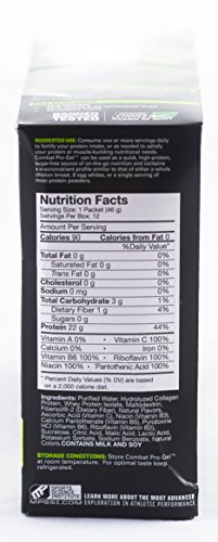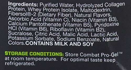 COMBAT PRO GELS are a high-protein, great-tasting, convenient snack that provide essential nutrients used to build and maintain lean muscle mass. Each serving features 22 grams of high-quality protein, zero sugar, no artificial dyes, and all 9 essential amino acids to effectively fuel your muscles while on the go!Feature