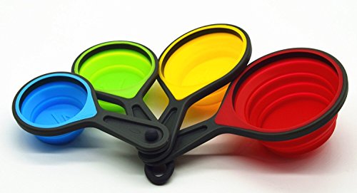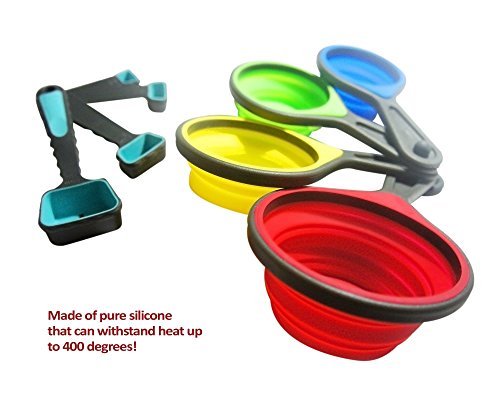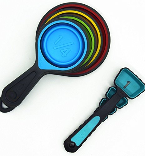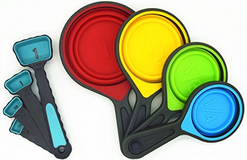 - #BPA FREE Collapsible Silicone Measuring Cups comes in bold and bright colors which includes 1-cup, 1/2cup, 1/3cup 1/4cup Measuring Spoons include ; 1 Tablespoon, 1-teaspoon, 1/2teaspoon,1/4 teaspoon. All measurements are boldly written on the cups and spoons so that they are easily spotted.