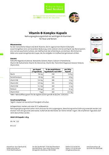 -. Binding : Badartikel -. Brand : Sanct Bernhard -. Feature : Für den menschlichen Körper sind die B-Vitamine von besonderer Bedeutung / Wichtig für das Nervensystem, Stoffwechsel, Schleimhäute und die Haut -. IsAdultProduct : 0 -. Label : Kräuterhaus Sanct Bernhard -. Manufacturer : Kräuterhaus Sanct Bernhard -. MPN : 122 -. PartNumber : 122 -. ProductGroup : Drogerie & Körperpflege -. ProductTypeName : HEALTH_PERSONAL_CARE -. Publisher : Kräuterhaus Sanct Bernhard -. Studio : Kräuterhaus Sanct Bernhard -. Title : Vitamin-B-Komplex-Kapseln