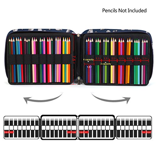 - Universal Adjustable Volume you can put your 100 120 132 144 150 pieces colored pencils or varias size makers on this pencil organizer. Each compartment has two sides of elastic holders, roomy for all your pencils, pens, markers, brushes and erasers / sharpeners. Each compartment has two sides of severn of 3cm and one of 4 cm por each elastic holders, roomy for all your pencils, pens, markers, brushes and erasers / sharpeners.