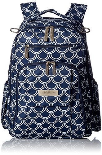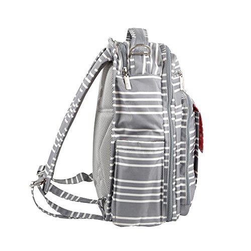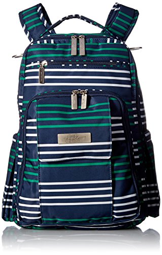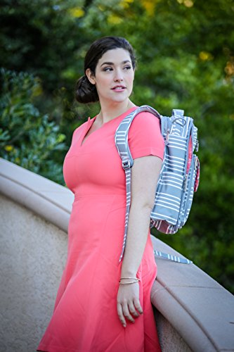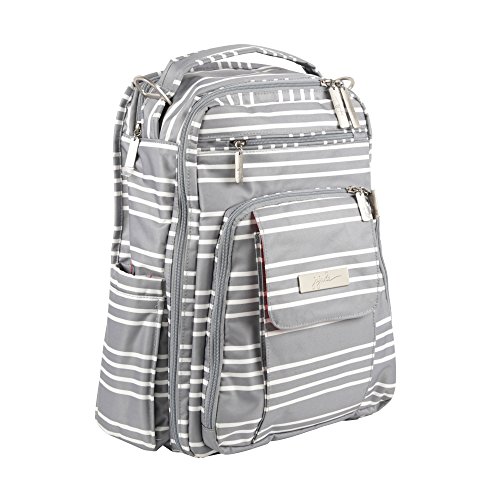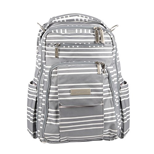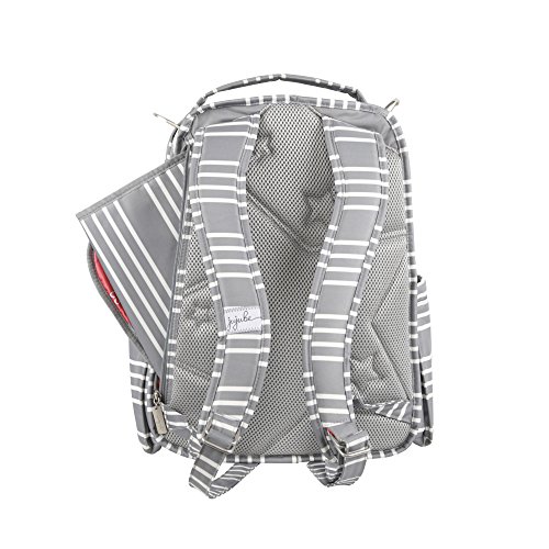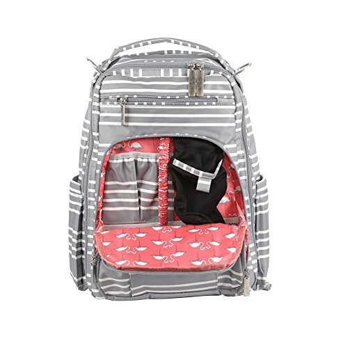 The Ju-Ju-Be Coastal Collection Be Right Back Backpack Diaper Bag is chic, smart and functional with added innovation and versatility. The Be Right Back is everything you want in a backpack diaper bag, but with stylish design, ergo straps and breathable mesh to keep you comfortable. The Be Right Back is great for adventures, day trips, or everyday outings. The lining is protected with Agrion natural treatment, which inhibits and reduces the growth of odor causing bacteria, mold and mildew. The outer fabric is treated with Teflon fabric protector, making it easy to repel stains and keep it clean. The front "mommy" zippered pocket is large enough to hold smartphones, wallets, keys and other personal items. Inside are (2) smaller pockets with a key fob stretch cord and a sunglass holder. A small external zippered pocket is constructed with soft felt that's perfect for small delicate items. The main zippered pocket is large enough for diapers, wipes, extra clothes and other items needed when you're on the go. "Smart" pockets are located on the front and top of the bag, perfect for storing additional diapers or wipes with easy accessibility. The back zippered pocket has an 11.5-inch opening that's large enough for your tablet or children's books and includes a matching memory foam changing pad. Bottle pockets are located on either side of the bag and insulated to keep your items hot or cold. The ergonomically curved shoulder straps with textured fabric underneath prevent the straps from sliding off your shoulders. This bag is machine washable and measures 12-inches by 16-inches by 5-inches in size. The East Hampton print is grey and white stripes with a flamingo pattern on a pink background for the lining. The print is accented by silver, metal hardware. All Ju-Ju-Be items come with a Lifetime Limited Warranty against manufacturing defects when purchased from an Authorized Ju-Ju-Be Dealer. Authorized Dealers can be found in the images.Feature