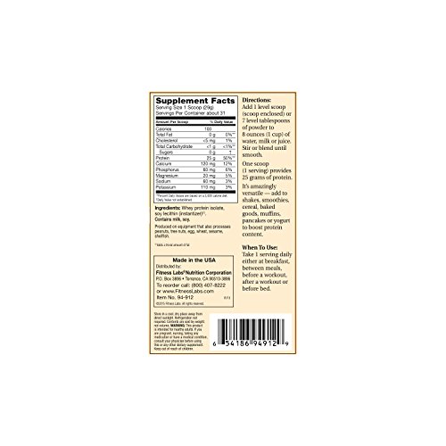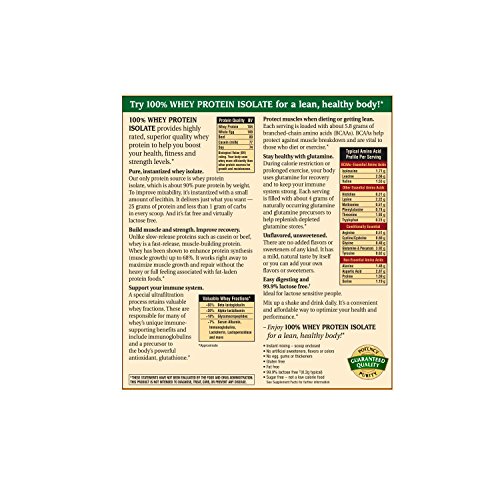 -. Feature : 100% WHEY PROTEIN ISOLATE provides the highest rated, best quality protein available to help you boost your health, fitness and strength levels.* / Each serving contains 25g of protein, 5.7g of BCAA's and 4.2g of glutamine and precursors / 25g of Protein -- 1g of Carbs -- 0g of Fat -- 110 Calories / No artificial sweeteners, flavors or colors, egg, gluten, gums or thickeners / You get pure, specially filtered, 100% whey protein isolate. It's the perfect choice for boosting the protein content of shakes, foods or baked goods like cookies, pancakes or muffins.