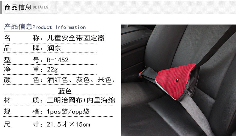汽车安全带都是为成人设计的,由于儿童身高还不够,系上安全带后,安全带常会穿过脖子,紧急刹车或发生意外的情况下就会非常危险,容易勒伤或割伤。如装这款儿童专用的三角安全带调节器之后,可避开儿童的脖子伤,可以较大限度的保护乘车儿童,避免在紧急情况下受到伤害,给孩子一个更安全的乘车环境。