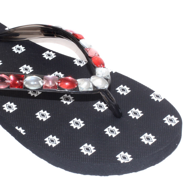 ベーシックなフォルムで鼻緒にストーンが散りばめられたビーチサンダルです。太陽や光に反射するストーンが華やかでビーチは勿論、デイリーシーンでも足元をオシャレ度をアップ!!また、きらびやかな雰囲気でラフでありながら大人の女性を演出し、リゾートシーンでのドレススタイルにもスタイリッシュに決まります。