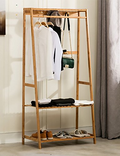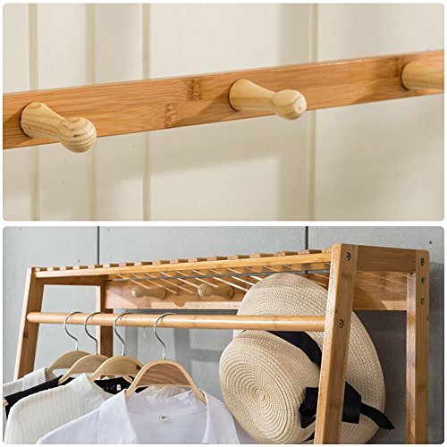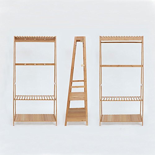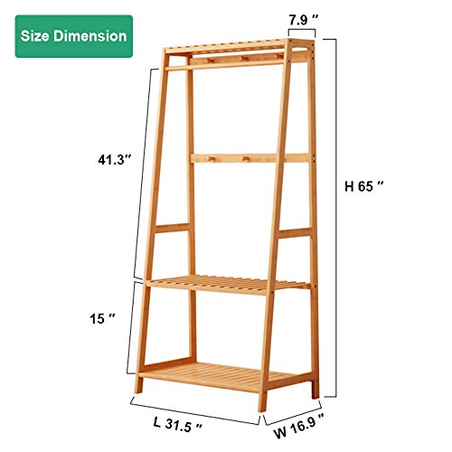 -. Feature : SPACE SAVING GARMENT RACK DIMENSIONS: H65in x L31.5in x W16.9in (H165cm x L80cm x W43cm),Weight :15.5lbs.Heavy Duty,easy to carry around without disassemble.Helps your closet look organized, neat and beautiful. / ENVIRONMENTAL BAMBOO WOOD:Cloth Rack is made of natural bamboo, environmentally,sturdy, wear-resisting,waterproof,dust-proof and easy to clean.Sunken screw holes and well polished bamboo to prevent any scratches of your family members,even for Children. / 3 TO 1 MULTIPLE USAGE: 3 Levels Slatted Shelves allows you to store shoes, shoe boxes, bags,suitcase,plants,coats,hats,scarves,books,toys and other sundries, 1 TOP HANGING ROD provides sufficient space to neatly hang your clothing ,dresses, shirts, tees or trousers.6 HOOKS,Ideal for robe, hats, coats, belts, bags, purse, scarves, dog leashes, brooms, mops, swifter, dust pan organize. / WIDEN APPLICATION: Durability and dependability , designed to hold a wide variety of items, ideal for foyers, hallways, bathrooms, kitchen, bedrooms, closets, living room, toilet, office, laundry rooms,showrooms, balcony ,supermarkets, school, classroom, workspace etc / SIMPLE ASSEMBLY:The portable clothes rack can be easily assembled with the included tools, accessories (Allen Key & Screws) and the instructions manual. Moreover, hanging clothes up after wash/tumble drying reduces the need for ironing and folding, thus, saving you time. This rack also helps eliminate clutter& makes belongings easily accessible.