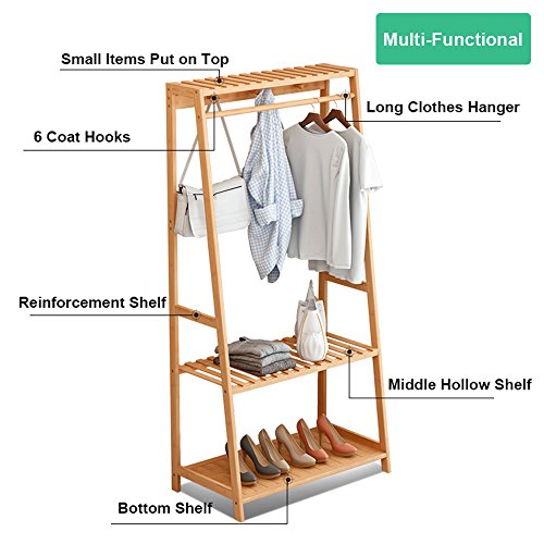 -. Title : Ufine Garment Rack Bamboo Wood Entryway Coat Rack 3 Tiers Shoe Clothes Storage Shelves 6 Coat Hooks 1 Hanging Bar for Bag Clothing Umbrella Holder Living Room Bedroom Hallway