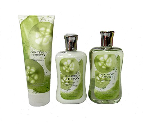 -. Feature : Bath & Body Works Cucumber Melon Trio Set. Body Cream, Shower Gel & Body Lotion / 1 Body Cream 8 fl oz Fortified with our exclusive Triple Moisture Complex of conditioning milk proteins, hydrating rice bran oil and protective acai berry extract, this velvety rich cream provides deep, 24-hour moisture to soften even the driest skin. Our emollient, yet non-greasy, formula deeply conditions, leaving skin moisturized, fragrant and more beautiful than ever before. / 1 Shower Gel 10 fl oz Wash your way to softer, cleaner skin with a rich, bubbly lather bursting with fragrance. Moisturizing Aloe Vera and Vitamin E combine with skin-loving Shea Butter in our most irresistible, beautifully fragranced formula! / 1 Body Lotion 8 fl oz / 236 mL Our hydrating, yet non-greasy, lotion leaves skin incredibly soft, smooth and nourished after just one use! Fortified with powerful ingredients like super conditioning Shea Butter, fast absorbing Jojoba Oil, and protective Vitamin E, our top rated formula is the ultimate total body moisturizer! / Top Notes: Fresh Cucumber Mid Notes: Cool Honeydew Dry Notes: Muguet, Soft Musk. KEY FRAGRANCE NOTES: Our original Cucumber Melon fragrance is a crisp, fresh scent that evokes the optimism of a dewy summer morning. An Online Exclusive Fragrance