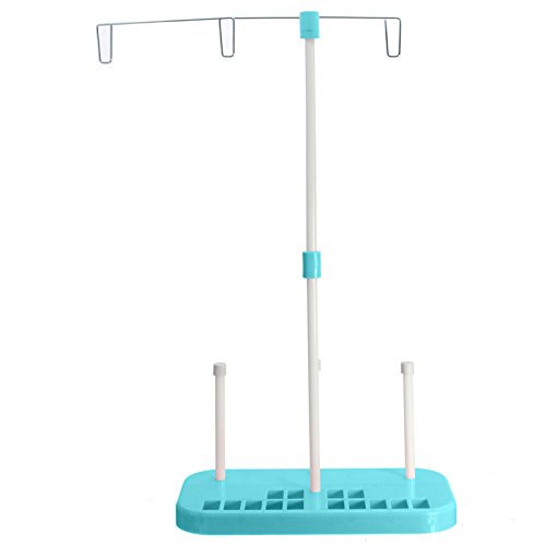 - ★ HOLDS 3 SPOOLS AND STORES A LOT MORE – This unique sewing machine or serger thread holder can hold up to 3 spools of threads and each thread can then be threaded through the corresponding metallic hoop provided vertically above each spool position. The stand also has space for storage of 15 bobbins, pins and a ruler – thus also helps you organise better. Our sewing / embroidery thread holder comes in a Teal Blue Color.