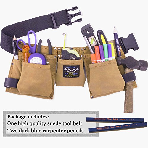 Package includes one kid size genuine suede leather tool belt & two blue carpenter pencils. Easy tool access & organizing with this kid's heavy duty tool apron. Must have for kids carpentry woodworking projects or pretend play.
