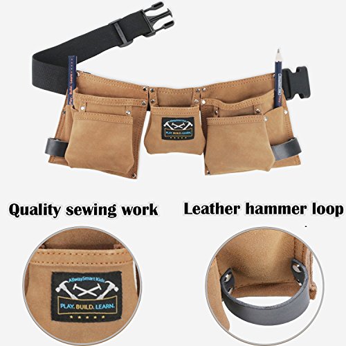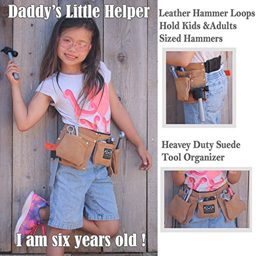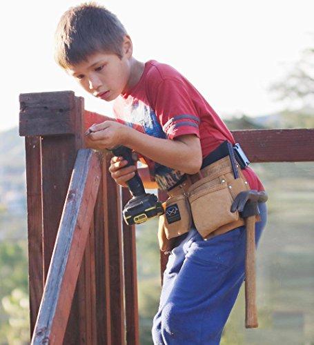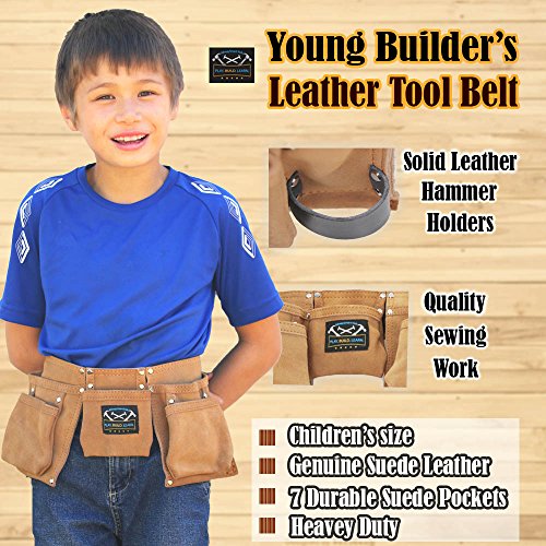 Boost your young builder's confidence with his own real tool belt. Specially designed for children. Fits waist size: 21" ~30". Recommended for ages 6 -12. 7 Durable suede tool pockets & pouches for kid's tools, toys, nails, carpenter pencils & more.