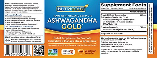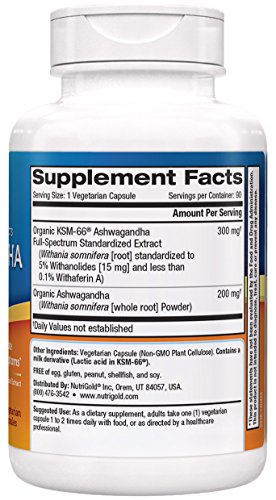 Nutrigold Organic Ashwagandha Gold, 500 mg, 90 Veggie Capsules - Clinically-Proven, Non-GMO, Full-Spectrum Root Standardized Extract Powder Supplement