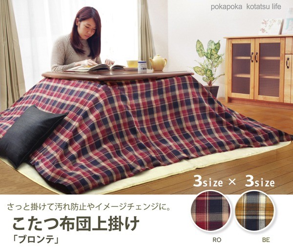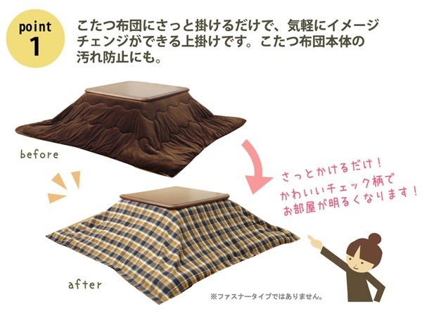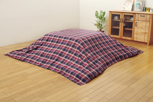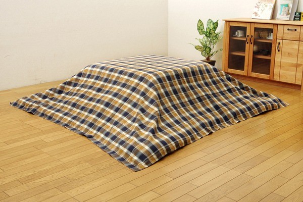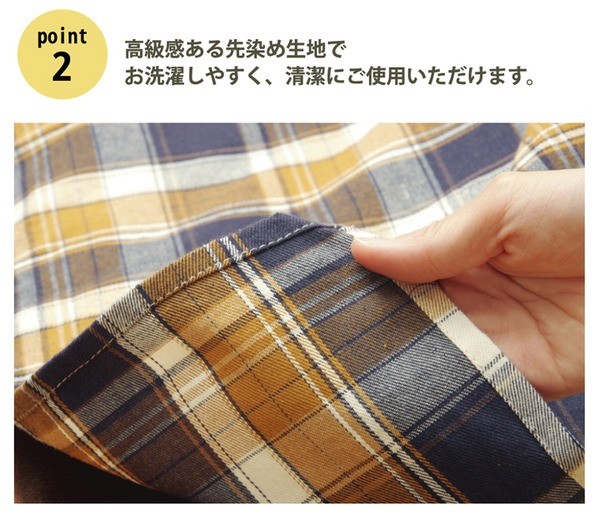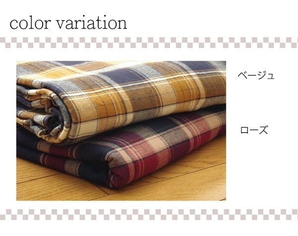 あたたかみのあるカラーと素材を使用したチェック柄のこたつ上掛けです。表地は綿100%です。綿はポリエステル素材に比べ静電気が起きにくく、繊維の中でも特に肌触りがよいのが特徴です。さらに糸を先に染色してから織る技法を採用しておりますので、プリントものや後から染色するものとは違う上質な雰囲気があります。
