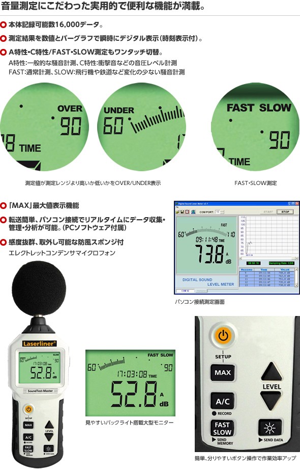 サウンドテストマスターは本体に測定音量16,000データを記録できるデータロガー機能付き騒音計。