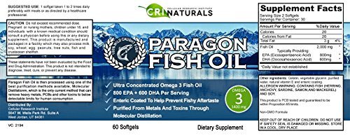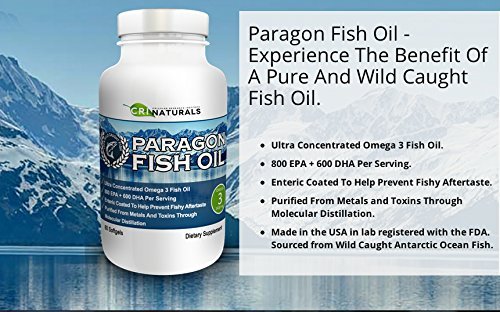 Paragon Fish Oil is rich in two Omega-3 Fatty Acids, EPA (eicosapentaenoic acid) and DHA (docosahexaenoic acid) which are recognized for their benefits in supporting cardiovascular health and normal blood pressure levels. Each serving typically provides 800 milligrams of EPA and 600 milligrams of DHA, more than twice the concentration of most fish oil products on the market. * We bottle fresh, ethically caught and produced, high quality and concentrated fish oil and ship it directly to you. We make sure that you get the fish as soon as it goes into the bottle. * Paragon Fish Oil is made with an Enteric Coating Process which allows the capsules to pass undissolved through the stomach into the intestinal tract where they break down. This eliminates the fishy aftertaste that could be an issue with uncoated capsules. * Paragon Fish Oil only uses all 100% pure wild caught fish oil, processed through the best purification methods available: Molecular Distillation. It is the only current method that can remove heavy metals, PCBs and other toxins not suitable for human consumption. Molecular Distillation preserves the quality of the fish oil and guarantees that no Trans Fats are created. * Fish Oil is full of Omega 3 Fatty Acids and is known to lower blood triglyceride levels, the free-floating fat in your bloodstream. Anyone who wants to experience superior long-term circulatory and cardiac health will benefit from a health investment in Paragon Fish Oil. * Paragon Fish Oil is manufactured in American facilities that have been registered with the FDA, and practice GMP policies.Feature