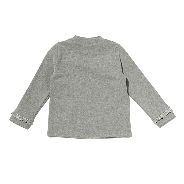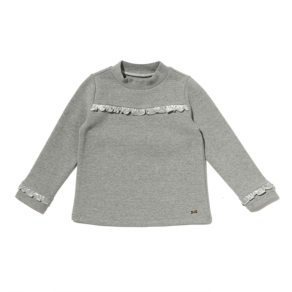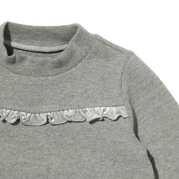 -양면 스판 소재로 된 반넥 티셔츠로 요크단과 소맷단에 벨로아 프릴 장식으로 포인트를 준 기본티 스타일입니다.