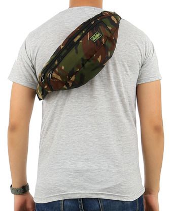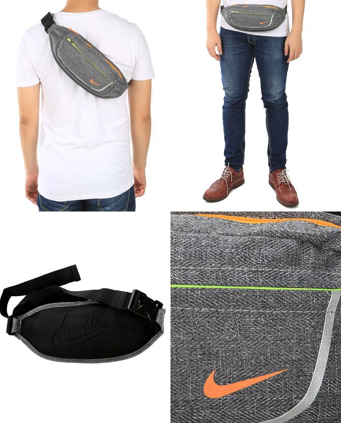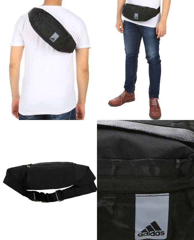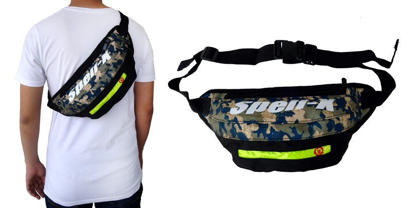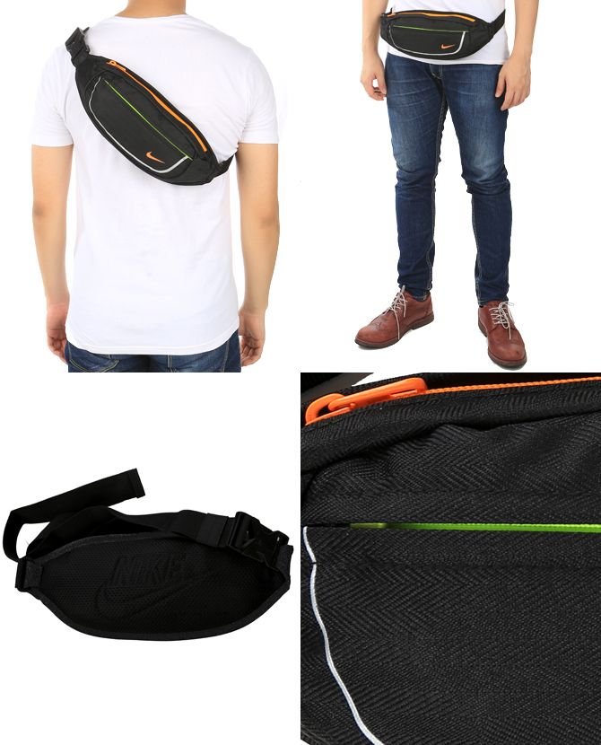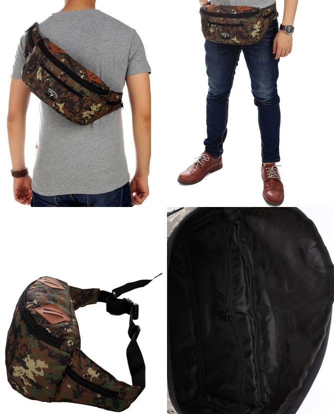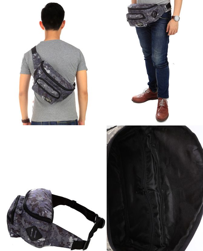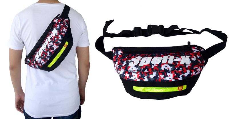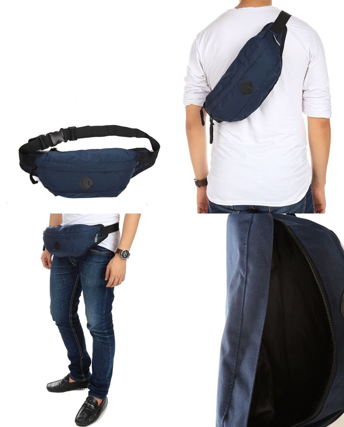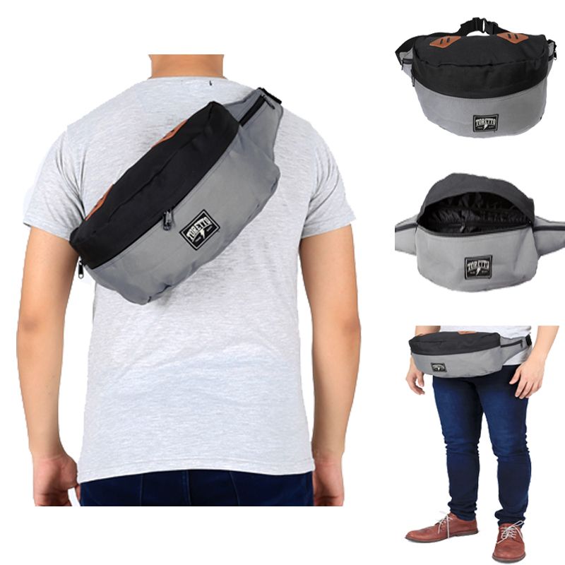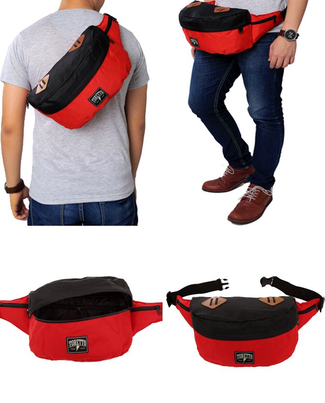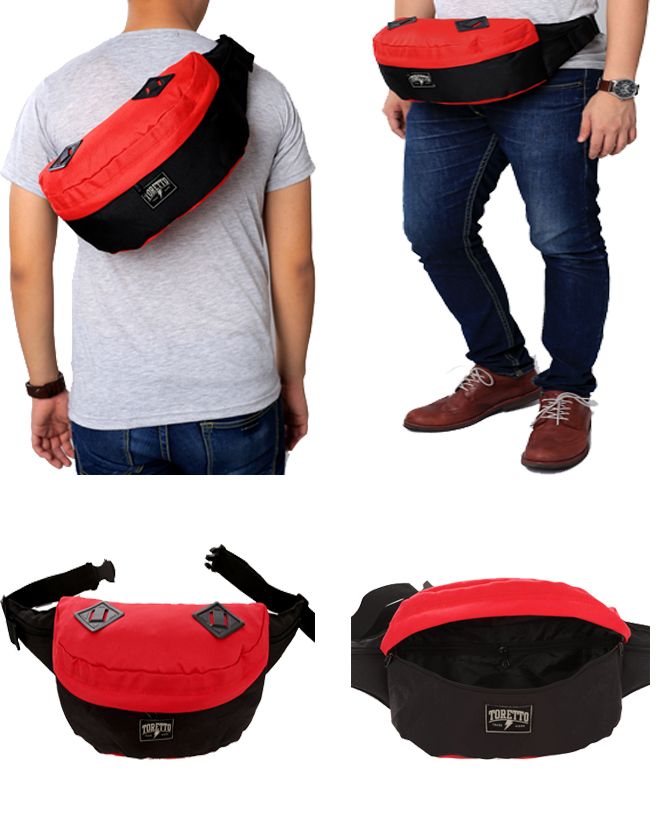 1 tempat penyimpanan besar dengan saku berseleting didalam, 2 tempat penyimpanan kecil di kedua sisi pinggang