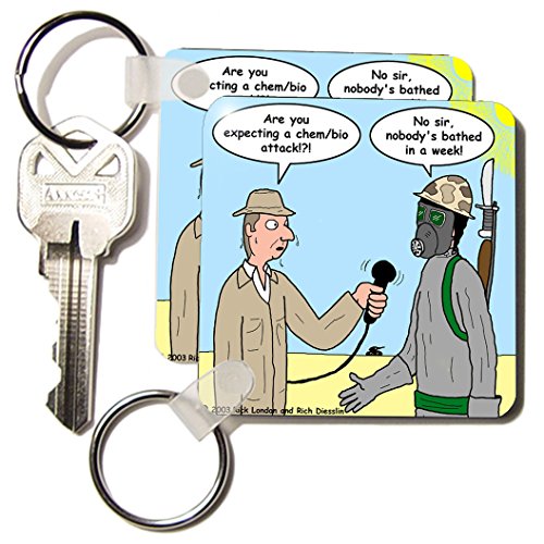 -. Binding : Apparel -. Brand : 3dRose -. Department : unisex-adult -. Feature : Made of heavy-duty durable plastic with high gloss finish / Available in sets of 2, 4 or 8 / Dimensions: 2 3/8" W x 2 3/8" H x 3/8" D / Image P.R.Inted on both sides of key chain. / Hardware included -. Model : kc_3065 -. MPN : kc_3065 -. PartNumber : kc_3065 -. ProductGroup : Apparel -. ProductTypeName : ACCESSORY -. Title : kc_3065 Rich Diesslins Funny Society Cartoons - Gas Mask Use in Iraq - Key Chains