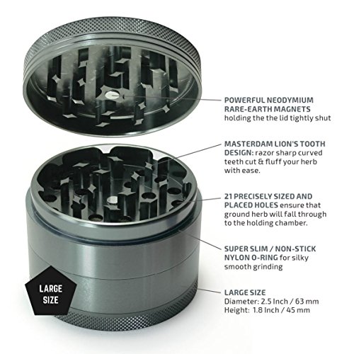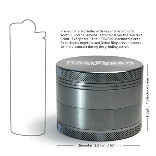GET THE PERFECT GRIND EVERYTIME - Masterdam 4-Piece 2.5" Herb Grinders feature Razor Sharp Curved Teeth that Shred & Fluff your Herb with Ease, while our precisely sized hole pattern ensures a consistent, perfect grind. You will LOVE using this grinder!