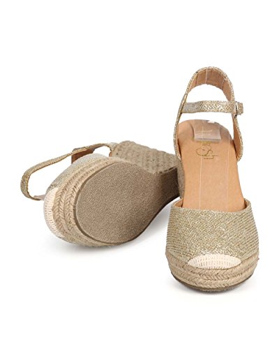(Refresh)/Women's/Sandals/DIRECT FROM USA/Refresh DI96 Women Glitter Cap Toe Ankle s trap Espadrille Wedge - Champagne