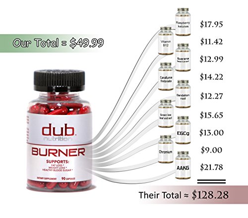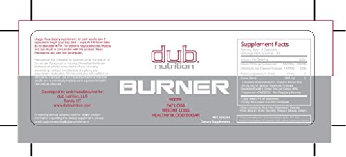 Studio : Dub Nutrition Publisher : Dub Nutrition Binding : Health and Beauty Product Description dub Burner focuses on healthy, sustainable weight loss by addressing five key factors to losing fat safely and effectively: appetite control, mental alertness, fat oxidation, athletic performance, and water balance. Fat loss isn't just about dropping the pounds. There is no quick fix or magic pill that can transform your body overnight, and starvation diets do more harm than good. Fat loss is about nutrition, smart supplementation and exercise, and dub nutrition is all about that! Our formula is the most advanced and well rounded weight loss product on the market. dub Burner doesn't contain ephedra or caffeine anhydrous, and it is not a "lose 20 pounds in two days" hype product. 30 day supply 0