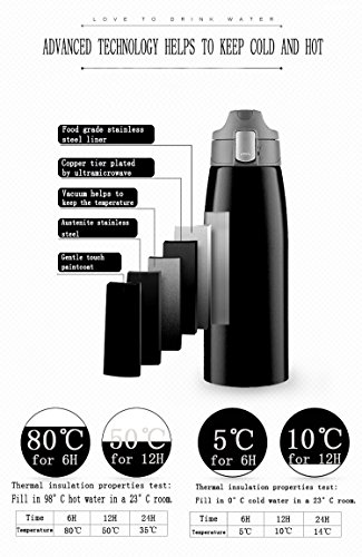 DOUBLE WALL TO KEEP COLD AND HOT- the vacuum insulated thermos flask can keep 122℉ hot water for 12 hours and 32℉cold water for 24 hours. You can have iced water in summer and hot coffee in winter with this water bottle.