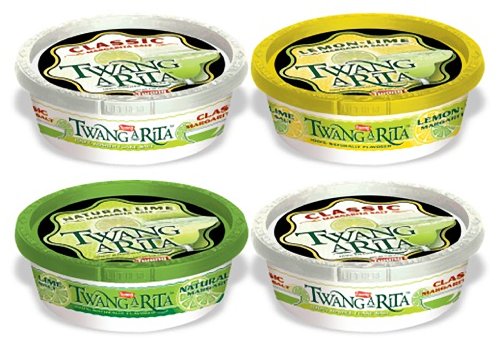 -. Binding : Kitchen -. Brand : Twang -. EAN : 0023604355000 -. Feature : Pack includes 2 Classic, 1 Lemon Lime and 1 Natural Lime Twang A Rita Tubs / A classic favorite! Twang's original margarita salt is made of premium ingredients to bring you a top quality margarita. / Twang lemon-lime blend is the perfect mate for a refreshing margarita. / The fresh flavor of lime pairs naturally with tequila. / This zesty salt is delicious as a margarita rimmer or alongside a shot of tequila. -. Label : Twang -. Manufacturer : Twang -. ProductGroup : Kitchen -. ProductTypeName : HOME -. Publisher : Twang -. Studio : Twang -. Title : Twang A Rita Classic, Lemon Lime & Natural Lime Assorted Flavors Margarita Salt (Pack of 4) -. UPC : 023604355000