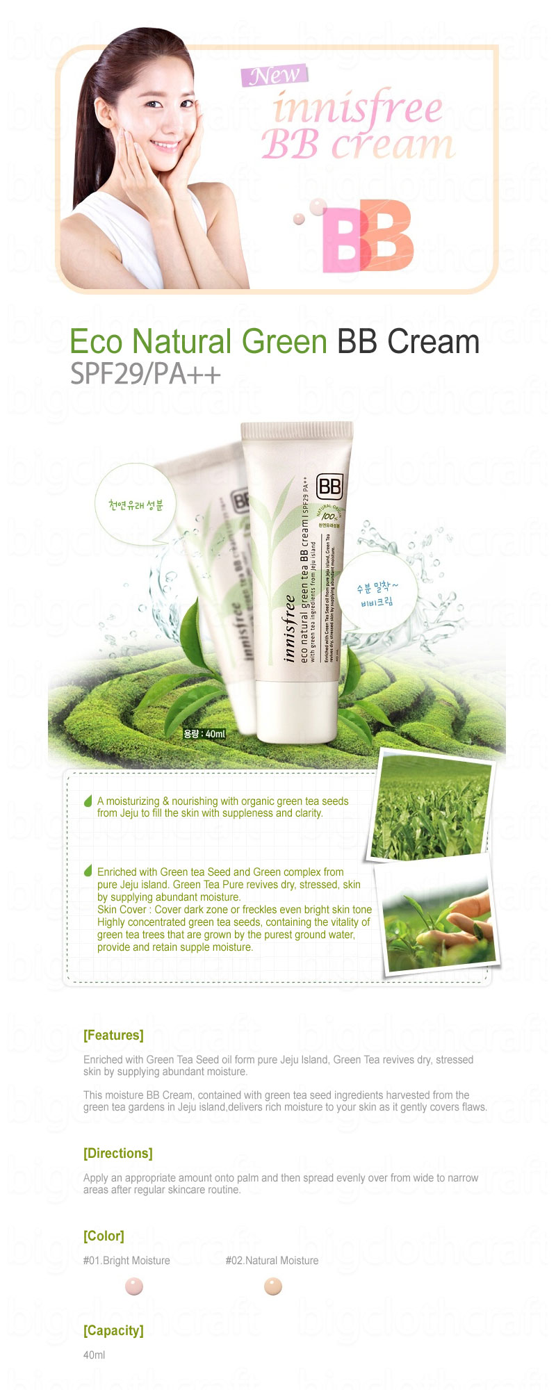 This moisture BB Cream, contained with greentea seed ingredients harvested from the green tea garden in Jeju island, delivers rich moisture to your skin as it gently covers flaws.