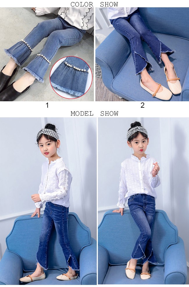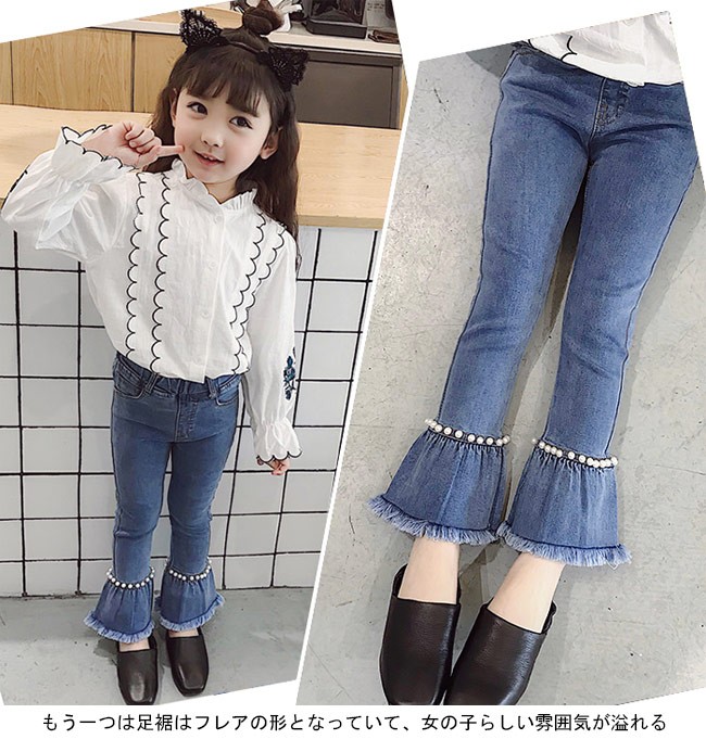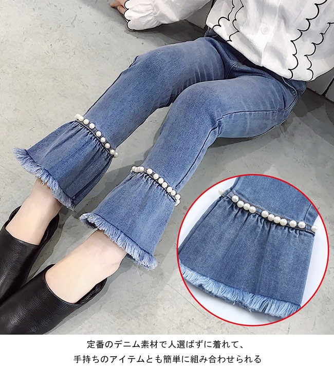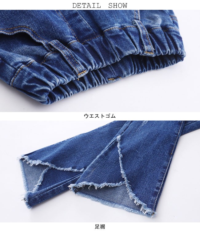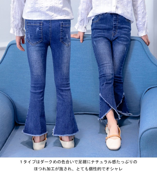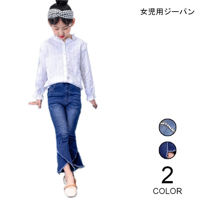 デニムパンツ 女児 ラッパズボン ジーンズ ウエストゴム 女の子 Gパン 春秋物 ボトムス ジュニア ジーパン ロングパンツ 子供用女の子用のデニムパンツが登場ラッパズボンのシルエットでとてもレトロな雰囲気を漂わせるデザイン異なる2タイプが用意されて、お好み次第で選べる1タイプはダークめの色合いで足裾にナチュラル感たっぷりのほつれ加工が施され、とても個性的でオシャレもう一つは足裾はフレアの形となっていて、女の子らしい雰囲気が溢れる定番のデニム素材で人選ばずに着れて、手持ちのアイテムとも簡単に組み合わせられるカラー:1 2素材 綿混紡サイズ(cm) 110 120 130 140 150 160110 総丈59 ヒップ54120 総丈64 ヒップ57130 総丈69 ヒップ59140 総丈74 ヒップ62150 総丈78 ヒップ64160 総丈83 ヒップ68ご注意:※サイズは平置きサイズです。素人採寸ですので、若干の誤差がございます、ご了承ください。