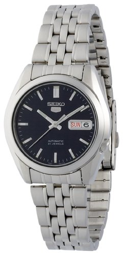 Seiko SNK357KC is a stainless steel automatic moment watch with black dial and calendar. The back of the watch is skeleton or clear.