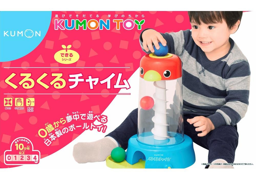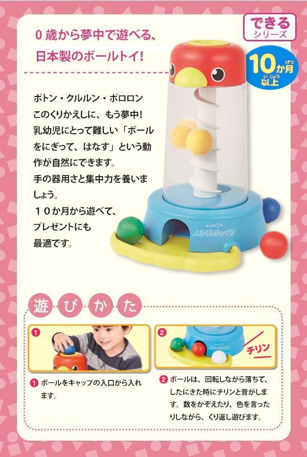 | ポトン・クルルン・ポロロン、このくりかえしにもう夢中!乳幼児にとって難しい「ボールをにぎって、はなす」という動作が自然にできます。手の器用さと集中力を養いましょう。10か月から遊べて、プレゼントにも最適です。 |