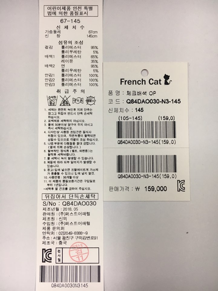 제품소재 : 겉감 폴리에스터95% 폴리우레탄5%배색1 폴리에스터65% 레이온35%배색2 면95% 폴리우레탄5%안감1 폴리에스터100%안감2 폴리에스터100%안감3 폴리에스터100%