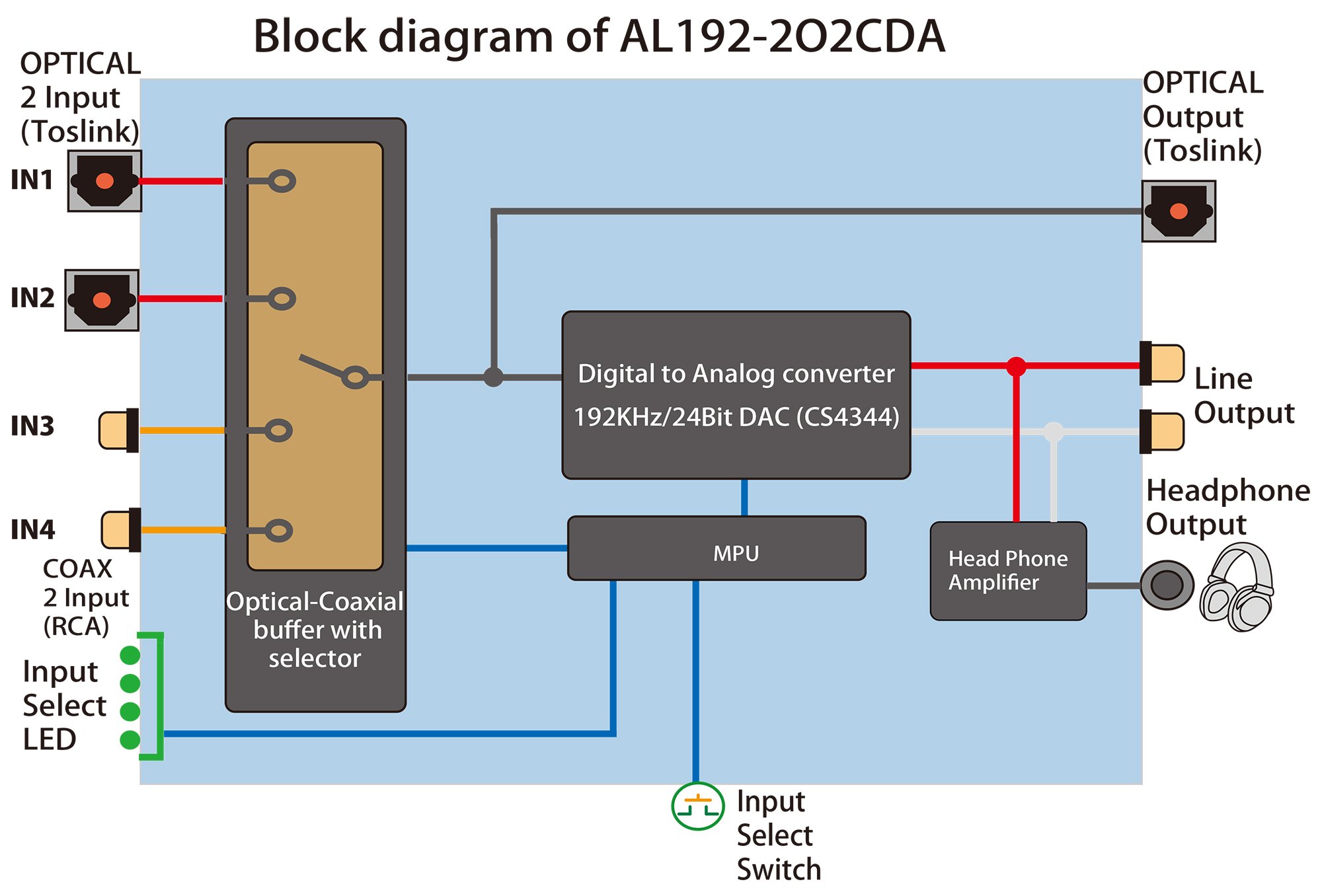 ● Two optical / coaxial digital inputs and 192 kHz / 24 bit compatible DAC and 192 kHz optical output DDC with optical digital / analog voice / headphone output ● Two optical / coaxial digital inputs, each with switch