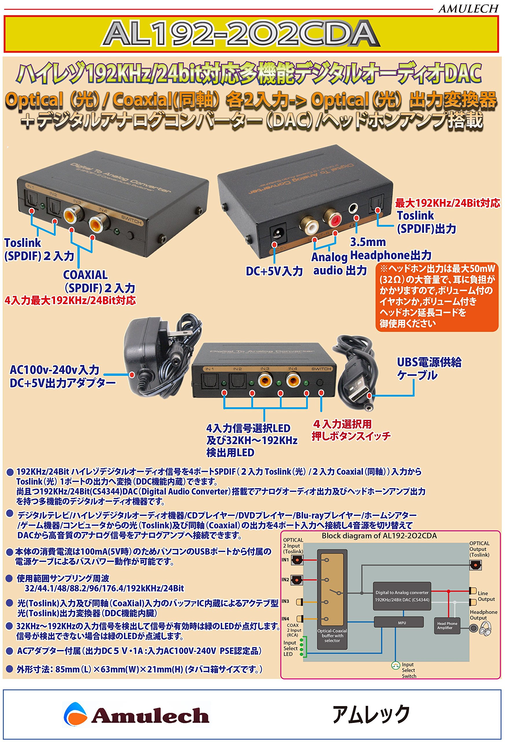 When using the DDC function, it corresponds to PCM / AC3 / DTS / THK / HDCD / LPCM format ● Power supply operates not only with the included AC adapter but also with USB bus power.