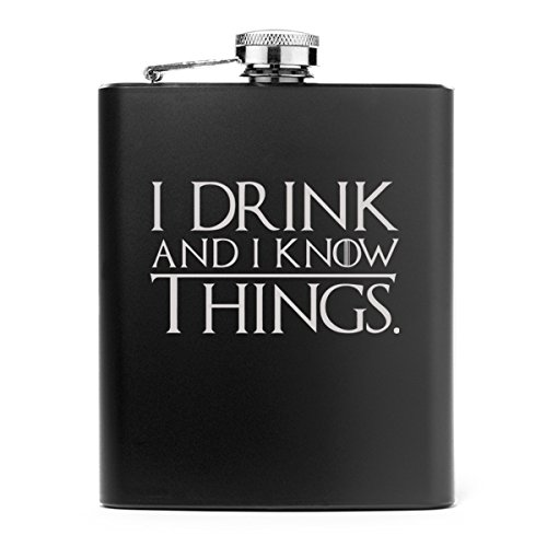 -. Brand : MIP -. Color : Matte Black -. EAN : 0712265131534 -. Feature : Matte Black 7oz Stainless Steel Hip Flask Funny I Drink And I Know Things / 7oz stainless steel hip flask with captive top / Dimensions are 5"H x 3.75"L -. Label : MIP INC -. Manufacturer : MIP INC -. ProductGroup : Kitchen -. ProductTypeName : KITCHEN -. Publisher : MIP INC -. Studio : MIP INC -. Title : Matte Black 7oz Stainless Steel Hip Flask Funny I Drink And I Know Things -. UPC : 712265131534
