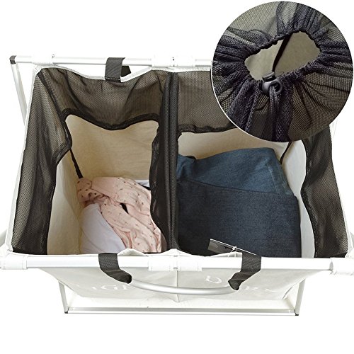 * Portable :To make it easily portable, 2 handles are located on either side of this double section laundry bag. It also features a draw string closing mechanism and easily detachable Velcro straps that attach it to the aluminum frame. meaning you can easily move it from room to room or building to building to collect and deposit laundry. Great for trips to and from self-service laundry centers. Plus, when it’s not in use our Folding Double Laundry Basket can be folded up for storage.