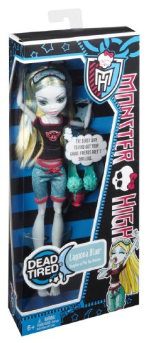 -. Binding : Toy -. Brand : Monster High -. EAN : 0433599353675 -. Feature : Get together for a sleepover and some scary fun ghoul time / These dolls are dead tired and in need of a little rest and relaxation / The trendiest ghouls at Monster High in their stylish sleepover fashions / Doll is fully articulated so they can be posed in many different ways / Includes Lagoona doll with eye mask, Dead Tired outfit and accessory for the sleepover -. IsAdultProduct : 0 -. Label : Mattel -. LegalDisclaimer : Warning: Choking hazard from small parts. Not for children under 3 years. -. Manufacturer : Mattel -. Model : BBR76 -. MPN : BBR76 -. PackageQuantity : 1 -. PartNumber : BBR76 -. ProductGroup : Toy -. ProductTypeName : TOYS_AND_GAMES -. Publisher : Mattel -. Studio : Mattel -. Title : Monster High Dead Tired Lagoona Blue Doll -. UPC : 746775272791 -. Warranty : No Warranty