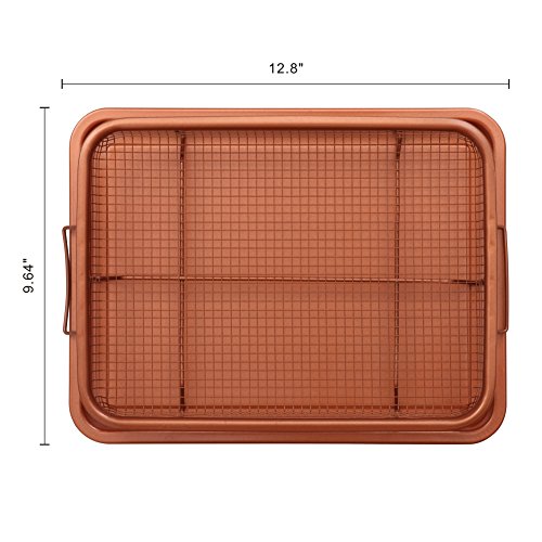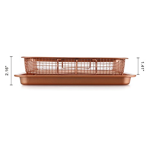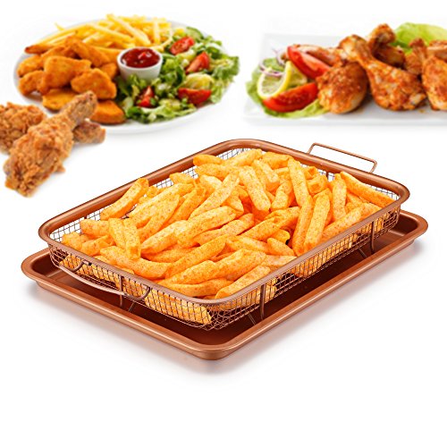 Studio : windaze Publisher : windaze Product Description his nonstick copper crisper tray turns your oven into a fryer. This allows you to fry things like chicken wings, homemade French Fries, mozzarella sticks and breaded shrimp without all the oil. This allows you to enjoy your favorite fried foods guilt-free! The secret is in the frying basket's ability to evenly distribute heat all around the foods. This is a 2 pc. kit complete with a frying basket and a baking sheet, which you can use on its own to bake cookies. Both pieces feature a heat-resistant, non-stick coating that holds up to 500 degrees, so you can even broil steaks! Cooks food on all sides at the same time. Fry foods without all the grease. Promotes healthy eating and weight loss. 0