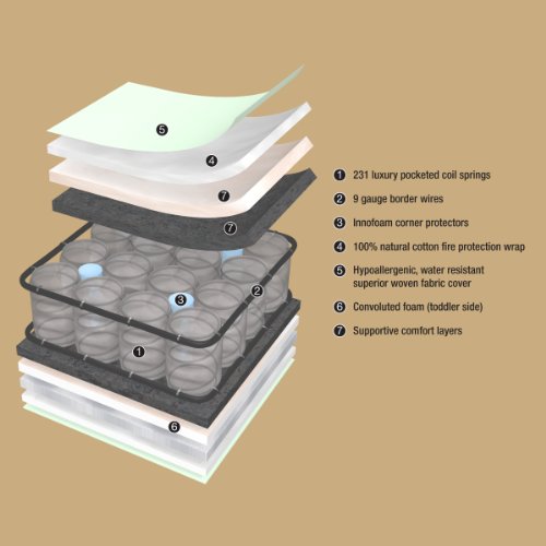 - Feature : 231 luxury Pocketed Coil Springs for even support; Reinforced border protection and Innofoam corner protectors provide stability / Natural cotton fire protection wrap has no chemicals, is non-toxic and meets or exceeds all federal flammability standards; Superior woven fabric cover features a medical grade waterproof barrier / Woven cover is water and stain resistant; 2-n-1 Design: one side provides ideal firmness for newborns and the flip side offers a layer of convoluted comfort for toddlers / GREENGUARD GOLD & CertiPUR-US certified for a healthier indoor environment; Limited lifetime warranty / Dimensions: 52 x 27.5 x <6 inches; Weight: 26 lbs; Made in USA