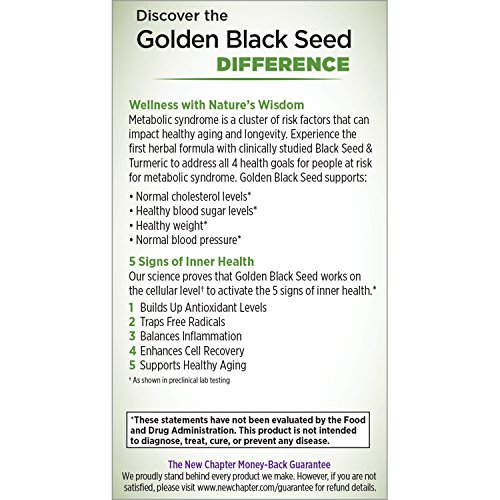 ReleaseDate : 2017-09-20 Studio : New Chapter, Inc. Publisher : New Chapter, Inc. Binding : Health and Beauty Product Description Almost 1 in 4 adults have metabolic syndrome, but what is it exactly? Metabolic syndrome involves measures of cholesterol, blood pressure, blood sugar weight. New Chapter’s NEW Golden Black Seed unleashes the synergistic benefits of two superfoods, Black Seed and Turmeric, as an ancient solution for the 21st century lifestyle. New Chapter delivers a clinically matched dose of these two powerful herbs to help support overall metabolic health: helping to maintain cholesterol levels in the normal range, as well as supporting normal blood sugar levels, body weight, and blood pressure.* Black Seed has also been shown to support calm, including support for stress , healthy mood , memory , alertness, and occasional anxiety.* *These statements have not been evaluated by the Food and Drug Administration. This product is not intended to diagnose, treat, cure or prevent any disease. 0