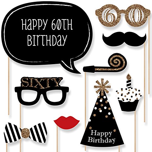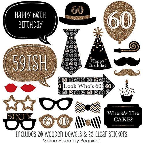 20-Piece Black and Gold Photo Booth Props Kit INCLUDES 20 Adult 60th Birthday photo booth props, 20 wooden dowel sticks and adhesives for assembly. EASY ASSEMBLY: Simply attach the printed DIY photo booth props to the wooden dowels with included adhesive and reinforcing stickers.