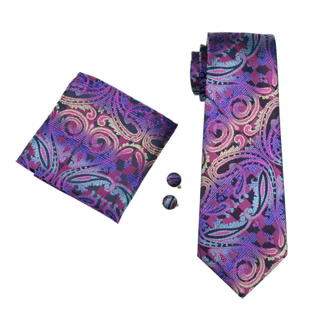 LS-638 남성 넥타이 100% 실크 보라색 페이즐리 자카드 짠 타이 + 손수건 + 커프스 세트 정장 웨딩 비즈니스 파티 무료 우표