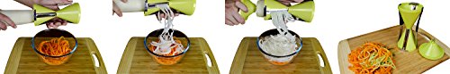 SUPERIOR FEATURES: You get all the benefits of a traditional "pencil-sharpener" spiralizer, plus 4 important enhancements: MINIMAL VEGETABLE WASTAGE - 50% less vegetable wastage due to the new deep-penetrating cap design | 150% BIGGER AND BETTER - The bigger size means it can accommodate vegetables up to 6.5 CM in diameter, compared to only 4 - 4.5 CM in the normal spiralizer. Additionally the longer blades mean a shorter time required to spiralize vegetables | 4 BLADE OPTIONS FOR ALL OCCASIONS - A total of 4 blades help produce the most common vegetable slicing patterns: 3 mm, 5 mm, 10 mm, and 70 mm (flat) noodle widths | EFFORTLESS CLEANING - The blades can be removed from the spiralizer for a thorough wash. No more reaching into the unit to clean the blades and risking getting a finger injury | Note: For the blade to be locked properly, first insert the blade into the blade slot, close the steel clip, and push the vertical lock all the way down on top of the steel clip. While cleaning, when you remove the blade from the blade slot, you may notice that the steel clip swings freely. This is not a defect. When the blade is inserted into the blade slot again, the steel clip will close properly.