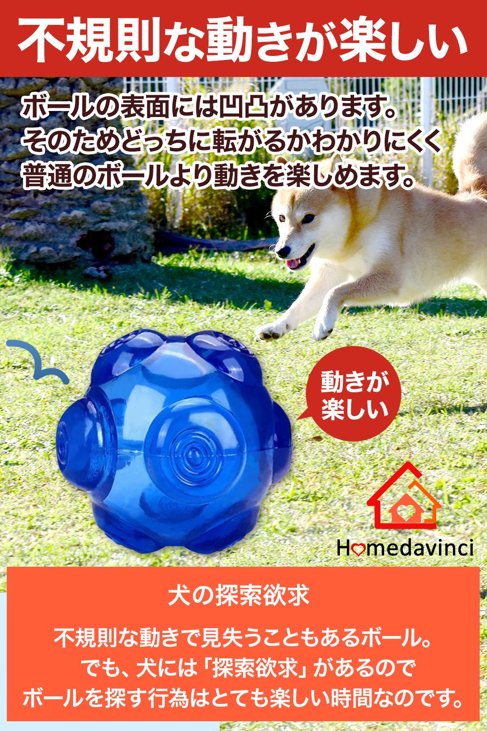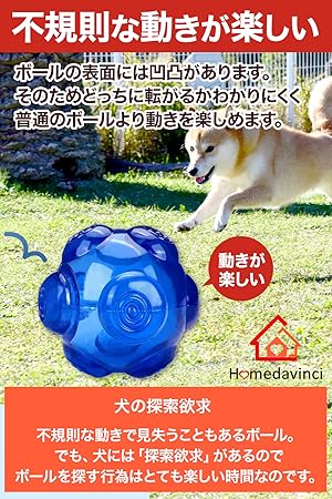 このボールの表面は凹凸があり、普通のボールと違ってどこに転がるかわからないので、そんな愛犬の探索欲求も満たしてくれます。