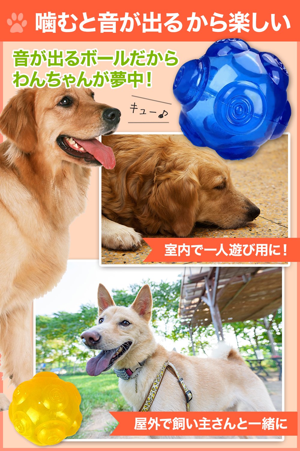 このボールは、音が鳴るので一人で噛んで遊ぶこともできますし、飼い主さんとコミュニケーションを取りながらボールを投げて遊ぶこともできます。