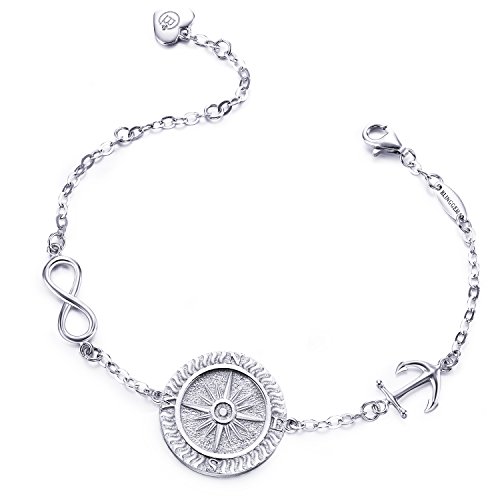 ☸BlingGem Exquisite Compass Rose Bracelet made with white gold-plated 925 sterling silver, decorated with 2 lovely hearts, extension design (17cm+2.5cm extension) to fit different wrist sizes. Lead-free and nickel-free.